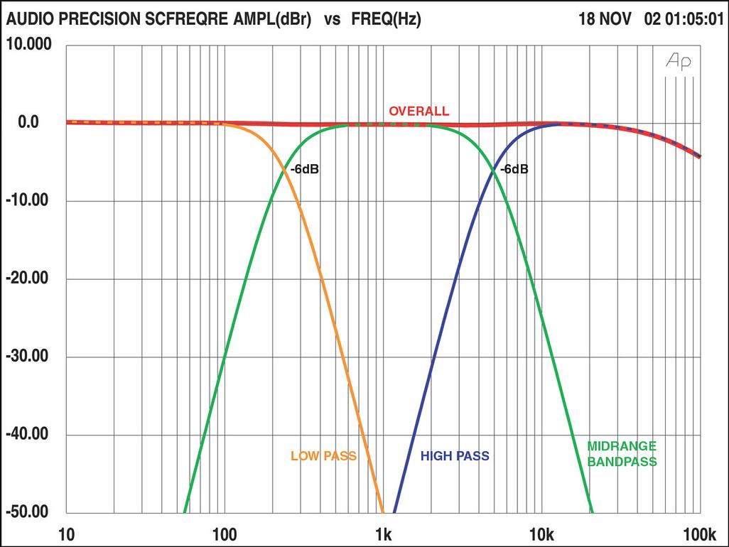 در هر باند چپ و راست، دو فیلتر 12dB/octave آبشار داده می شوند تا یک شیب فیلتر کلی 24dB/octave ایجاد کنند. این بسیار شیب دارتر از آن است که معمولاً در شبکه های کراس اوور غیرفعال (پسیو) استفاده می شود.