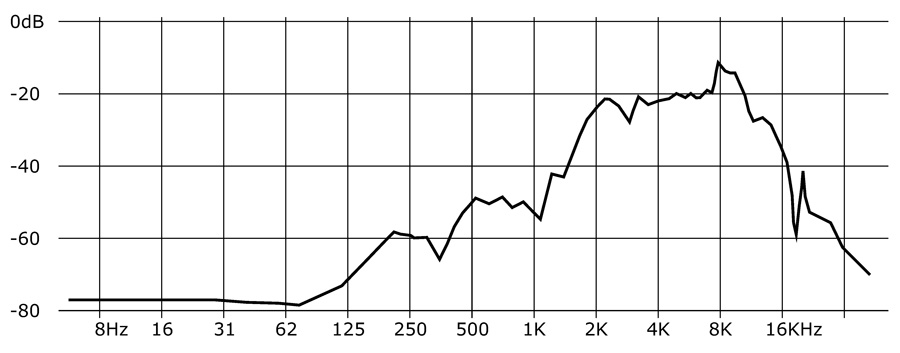 فرکانسهایی که بیشترین تقویت توسط این فیلتر انجام میشود، بین ۲ کیلوهرتز و ۱۶ کیلوهرتز هستند و بالاترین پیک آن در ۸ کیلوهرتز است. این نمودارها با پخش نویز سفید، سپس ضبط صدای خروجی از فیلتر و عبور صدا از یک تحلیلگر طیف به دست آمدهاند. بنابراین، این نمودار نسبتاً قابل اعتماد است، زیرا از یک میکروفون خوب برای ضبط صدا استفاده شده است.